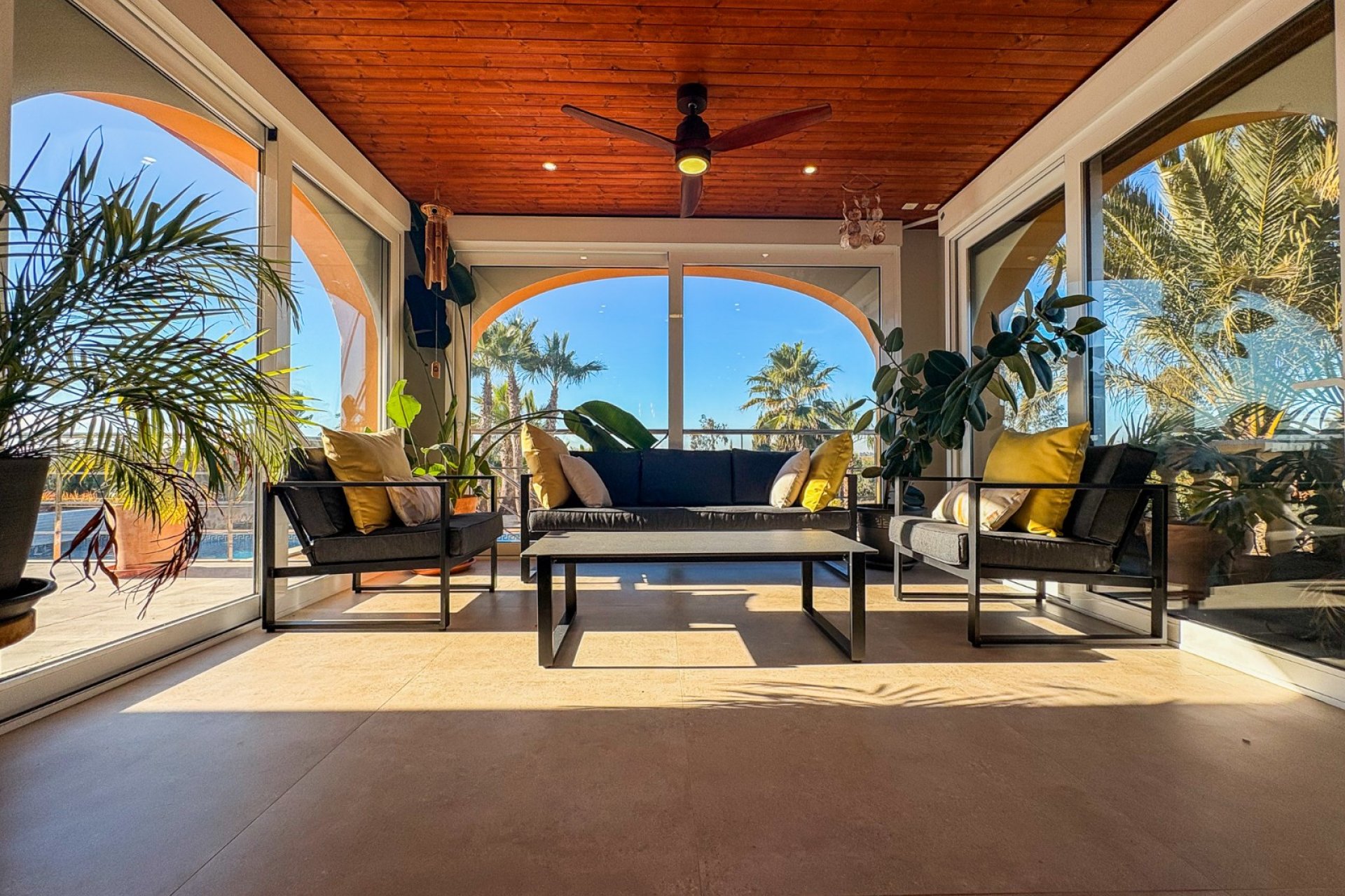The exterior offers a meticulously maintained environment with a heated swimming pool , barbecue area , several covered terraces , and a covered parking area for two vehicles. The property incorporates a 7 kW hybrid solar system that improves energy efficiency and a water pumping system connected to both agricultural water and the mains supply . The house also features a full-roof gutter system that optimizes rainwater collection and drainage. The furniture is not included in the sale.