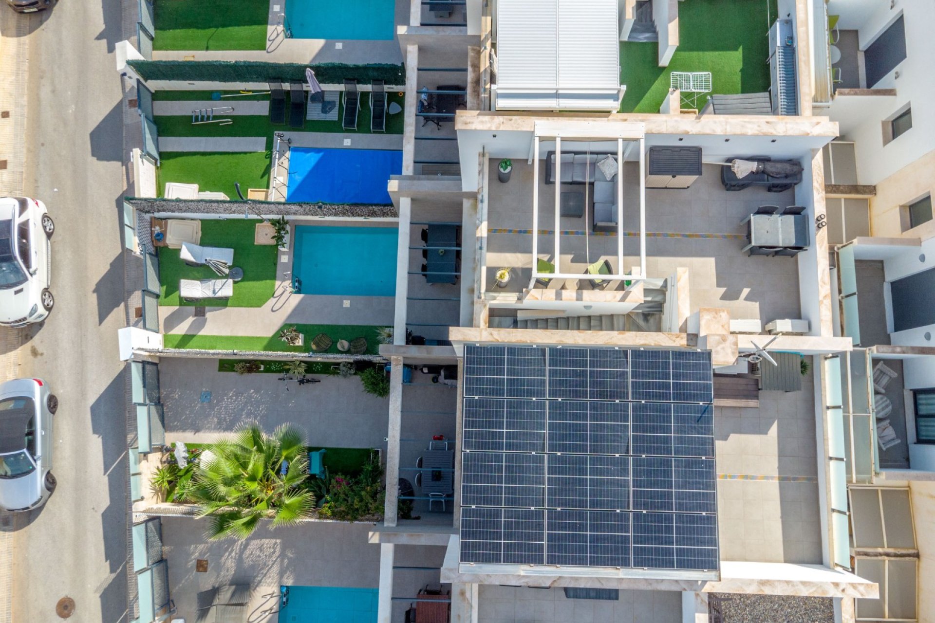 Moderno adosado con piscina privada y solárium Te presentamos este moderno adosado que ofrece 3 dormitorios, 3 baños, una piscina privada y un precioso solárium con vistas. La vivienda se distribuye en dos plantas y combina un diseño contemporáneo con el máximo confort, siendo ideal tanto como residencia habitual como vivienda vacacional. En la planta baja se encuentra un luminoso y amplio salón con cocina abierta de estilo moderno, que se entrega totalmente equipada con electrodomésticos. En esta planta también hay un dormitorio y un baño, perfecto para invitados o para quienes prefieren tener una habitación en la planta principal. La primera planta cuenta con dos dormitorios adicionales, ambos con su baño en suite, lo que aporta mayor comodidad y privacidad. El solárium bien aprovechado ofrece unas vistas fantásticas de la zona, ideal para tomar el sol o disfrutar de agradables veladas bajo las estrellas. La vivienda se vende completamente amueblada, y se ha cuidado cada detalle: dispone de aire acondicionado en toda la casa y suelo radiante en los baños, garantizando confort durante todo el año. En el exterior podrás disfrutar de tu propia piscina privada y de varias terrazas, perfectas para relajarse o pasar momentos agradables con familia y amigos. Además, los residentes tienen acceso a una zona comunitaria con piscina y zonas verdes, donde se puede disfrutar de un ambiente tranquilo y acogedor. Situada en la prestigiosa zona de Villamartín, en la Costa Blanca, esta vivienda goza de una ubicación privilegiada, rodeada de hermosos paisajes y con excelentes servicios. A pocos minutos encontrarás campos de golf, restaurantes, cafeterías y tiendas, así como las maravillosas playas de Orihuela Costa. El aeropuerto de Alicante se encuentra a unos 45 minutos en coche. Villamartín es la elección perfecta para quienes sueñan con un hogar moderno, soleado y tranquilo, cerca de todo lo mejor que ofrece la Costa Blanca.