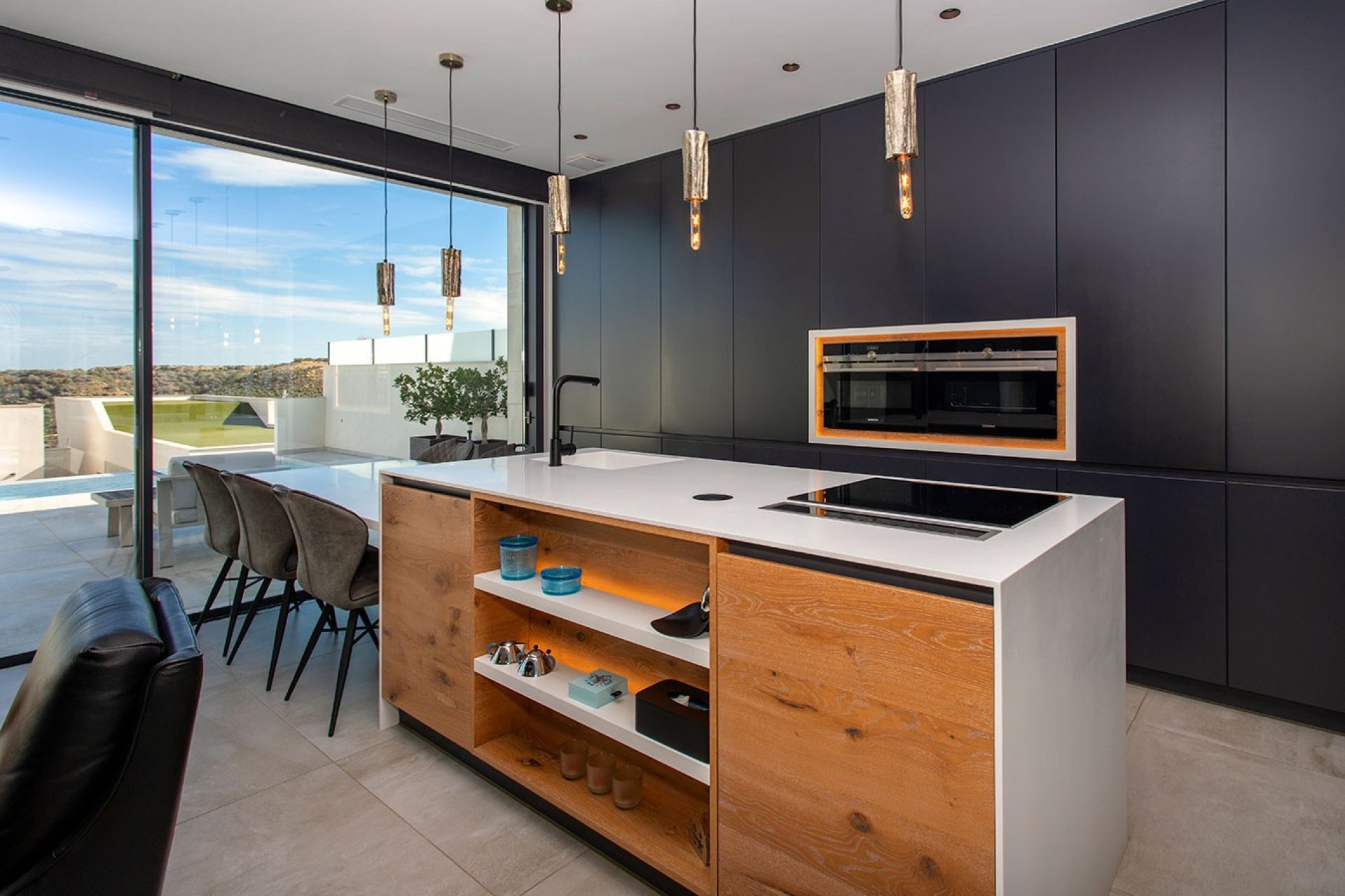 Esta hermosa y reciente propiedad combina arquitectura moderna, acabados de alta calidad y una ubicación excepcional con impresionantes vistas a las montañas y al mar. Con 252 m² de superficie habitable distribuidos en tres plantas, esta villa ofrece espacio, luz y confort en abundancia. La cocina abierta es un verdadero punto fuerte: todos los electrodomésticos están integrados de manera elegante y una isla central con mesa para 6 personas es perfecta para cenas y largas veladas con familia o amigos. Grandes ventanales corredizos proporcionan mucha luz natural y conexión directa con el exterior. La vivienda cuenta con 3 amplios dormitorios, cada uno con baño en suite con acabados en azulejos de alta calidad y materiales naturales, además de un aseo de invitados. La zona de lavandería con lavadora y secadora integradas aporta funcionalidad y estética en toda la vivienda. En el exterior, disfrute de una gran terraza soleada con pérgola bioclimática y una piscina infinita de 20 m² con cubierta eléctrica, ideal para disfrutar del sol todo el año. La zona polivalente con sauna, espacio de oficina y área de entretenimiento/fitness se puede adaptar según sus necesidades: wellness, gimnasio en casa, hobbies o espacio adicional. Extras: Suelo radiante en la planta baja y en los baños Aire acondicionado Paneles solares Garaje (único en la región) La vivienda está perfectamente mantenida y refleja calidad. Los muebles de alta gama se pueden adquirir opcionalmente. Ubicación privilegiada: cerca del campo de golf de Rojales, tiendas, restaurantes, bares acogedores y el parque natural protegido El Recorral, un oasis verde con senderos, lagos y áreas de picnic. Excelentes conexiones con otras localidades. ¿Interesado? No dude en contactarnos hoy mismo!